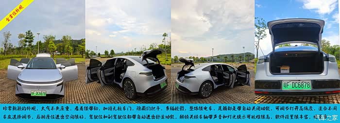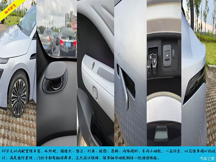 好看的一点就是无框车门,很有个性,翅膀打开,飞一样的感觉,没有框,直接可以用手按在玻璃上关门,一点问题都没有;车内中控屏可开启后备箱,外面可按自动关闭,高级感十足,带钥匙设置后可自动打开,就是车门的储物对大一点杯子放下去,雨伞毛巾之类没问题 。市区内噪音小,但高速胎噪偏大,坐在后排,很明显。