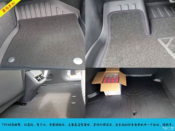 TPE的双层脚垫,后排很平整,方便打理,防滑性很强,没有异味,水一冲晾一会就可以安装上,尺寸这些都比较服帖;后备箱垫尺寸大小合适,保护一下原车的底面,放置东西的时候也不用小心翼翼的了。