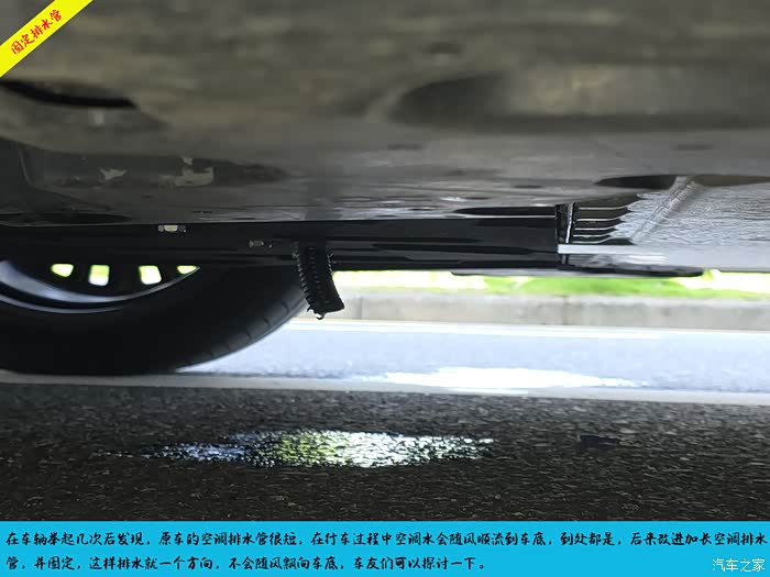 原车的空调排水管很短,滴下来的水随风飘到电池的护板上,蔓延到处都是,后来延长了排水管并固定,这样水不会飘到电池防护板上了。车友参考一下看看有没有必要进行固定延长。