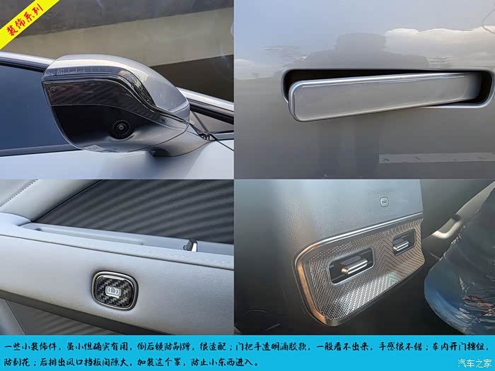 购买了一些小饰件,虽小但都比较实用,倒后镜的防撞贴条,颜色和原车色搭配,遇到被刮花的地方有效提升原车的损伤;门把手透明滴胶的贴条,这个用处不是很大,竖面没法贴,起不到开门撞在其他地方刮花的作用,但是手感不错;车内电子开门按钮,挺好,防止划伤面板;后排空调排风口原来的间隙很大,小孩子零食或者小东西容易掉进去,贴上这种好看又起到一点作用。