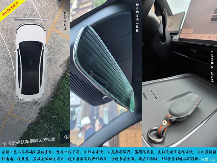 倒车360全景确实很好用,就是摄像头的拼接画面处还有点不完美,我看了很多电车的,拼接属于行业现象,都处理的不完美,N7摄像头很清晰,方便观察周围和前后,配合雷达,效果很不错;车内倒后镜,车友们斜着看上去,有很多层,是专门用心得设计,还是行业电车都是,晚上效果一般,重叠画面明显;中控台下方方便之处的充电位,两部手机都可以实现充电,还有散热孔,考虑周到。