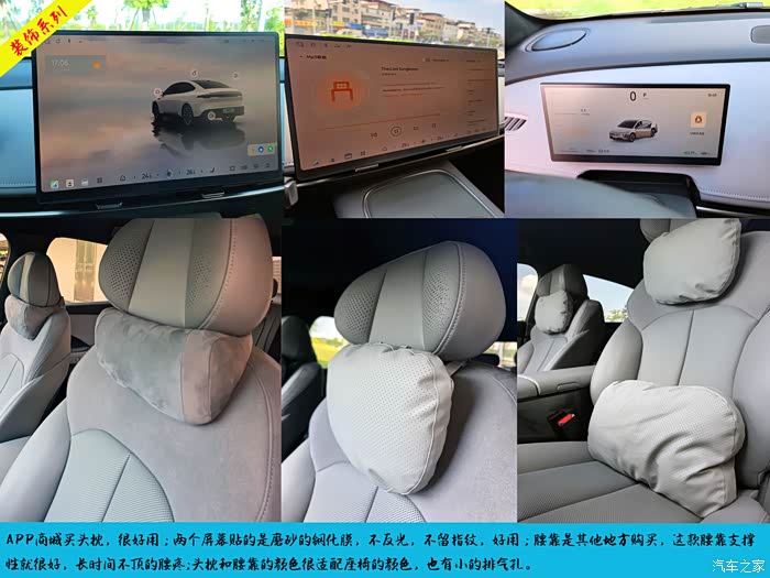 2个屏幕都买了磨砂的贴膜,磨砂有好处就是在光线强的时候不那么反光,并不留指纹,贴的时候很方便;座椅的头枕和腰靠有商城购买的也有其他渠道购买的,后来还是这种腰靠比较舒服,前后排都有头枕,后排的家人也喜欢这种头枕。