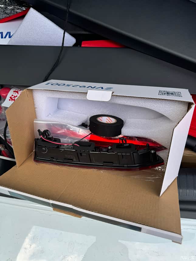 原装附件的包装盒比较大,里面有工具、说明书、两个尾灯、线束和隔音胶带。