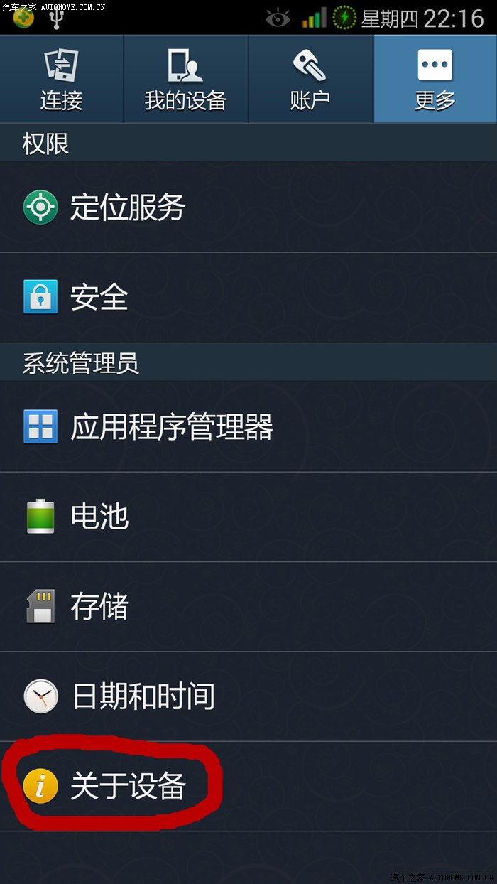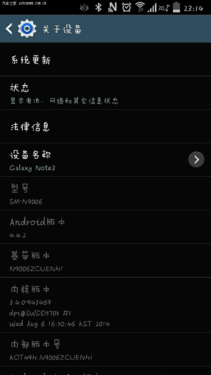 如下画面:第二步:按手机屏幕左下角“设置键”,会弹出“设定”显示如下画面:第三步:按下“设定”会出来如下画面:(安卓版本不同显示画面也不相同,能找到对应按键就可以)第四步:点击”更多“会出现如下画面:第五步:点击”关于设备“会出现如下画面:第六步:可以看到画红色圈位置显示型号为:GT-I9500,这就是我强调的国际版的手机型号,现在知道你的手机是什么版本了吧