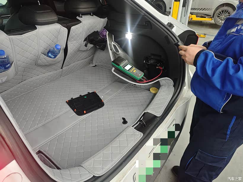 接着,车辆被举升机缓缓抬起,底盘全貌清晰地展现在眼前。技师拿着手电筒,逐一检查底盘护板、悬挂球头和减震器,还耐心清理了轮胎花纹里的小石子,用专业工具测量了胎压和花纹深度,告诉我轮胎状态还不错,让我放心。另一边,另一位技师正在处理玻璃异响,他用内饰板拆卸工具拆开右后门板,发现是导轨干涩导致的,涂抹了专用润滑脂后,反复测试了几次,异响果然消失了。