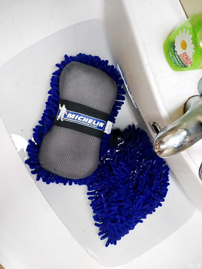 洗车海绵容水量很大,3008这种体积的车,也就只需要蘸四五次洗车液就能全部洗完。
