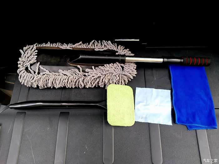 先看这四样,扫灰的大拖把、擦内饰的蓝色方巾、清洁记录仪镜头的浅蓝色小麂子皮,还有个绿色的小拖把。