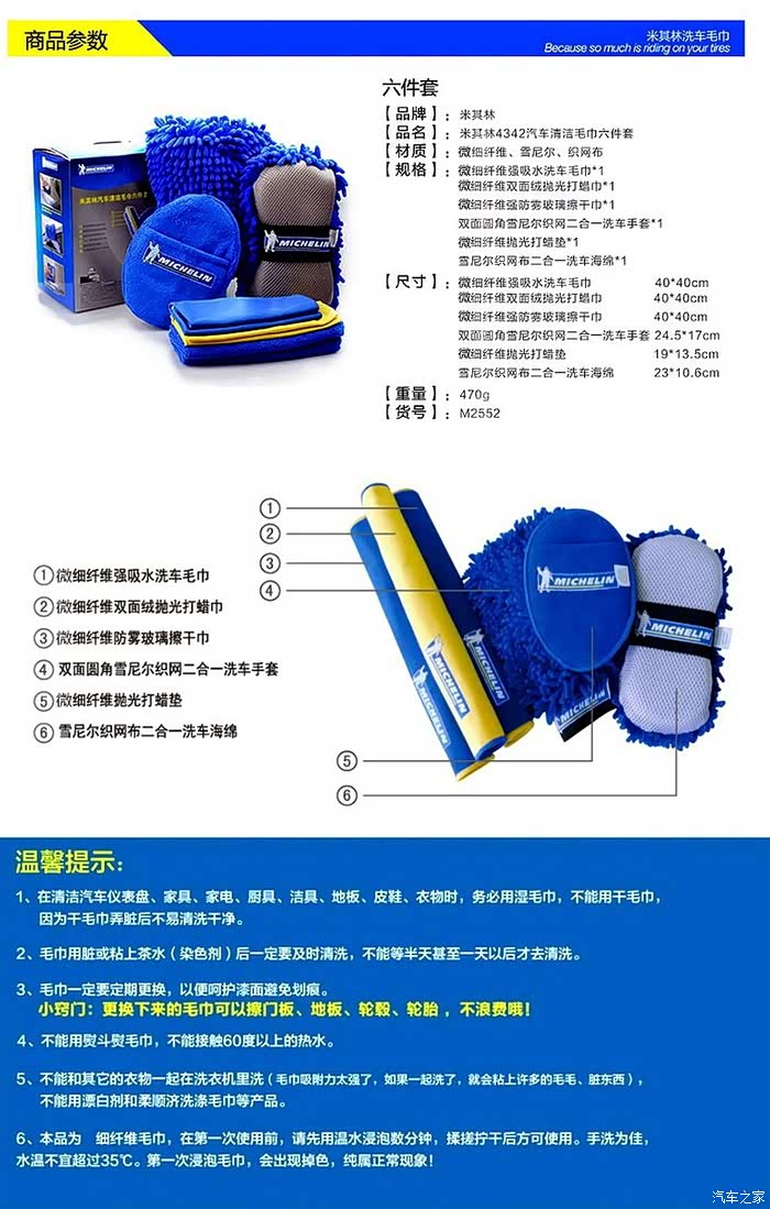 这款米其林的洗车巾套装是十分实用、同时效果非常令人满意的产品。内装的六件套,都经过了科学且人性化的设计,可以适用于不同的场合,完全能够满足车辆日常的全部清洁养护所需。对于众位洗车打蜡喜欢自力更生的车友,我推荐这款米其林的洗车巾套装,它的表现绝对不会让你失望!