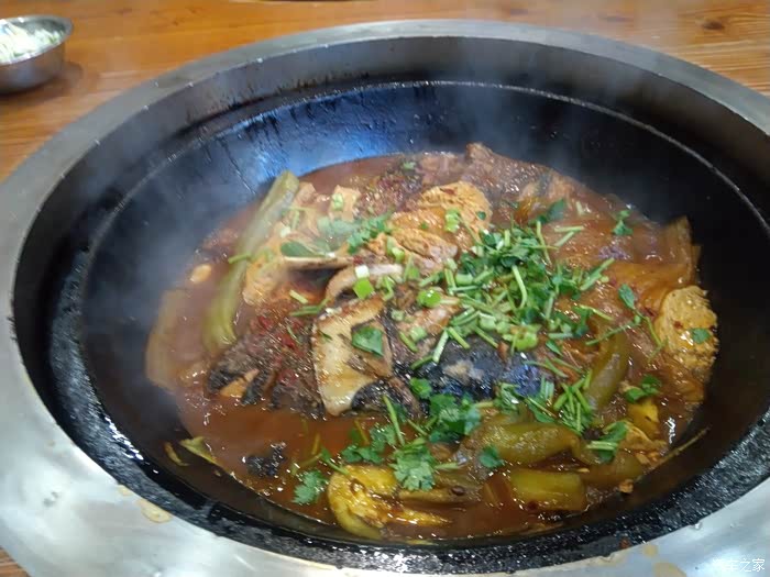 还有一道菜就是铁锅炖河鱼了,里面还放了茄子等配菜,真的是非常的美味呀。即人们一起聚餐真的是欢声笑语不断,这就是家的感觉幸福的感觉吧。