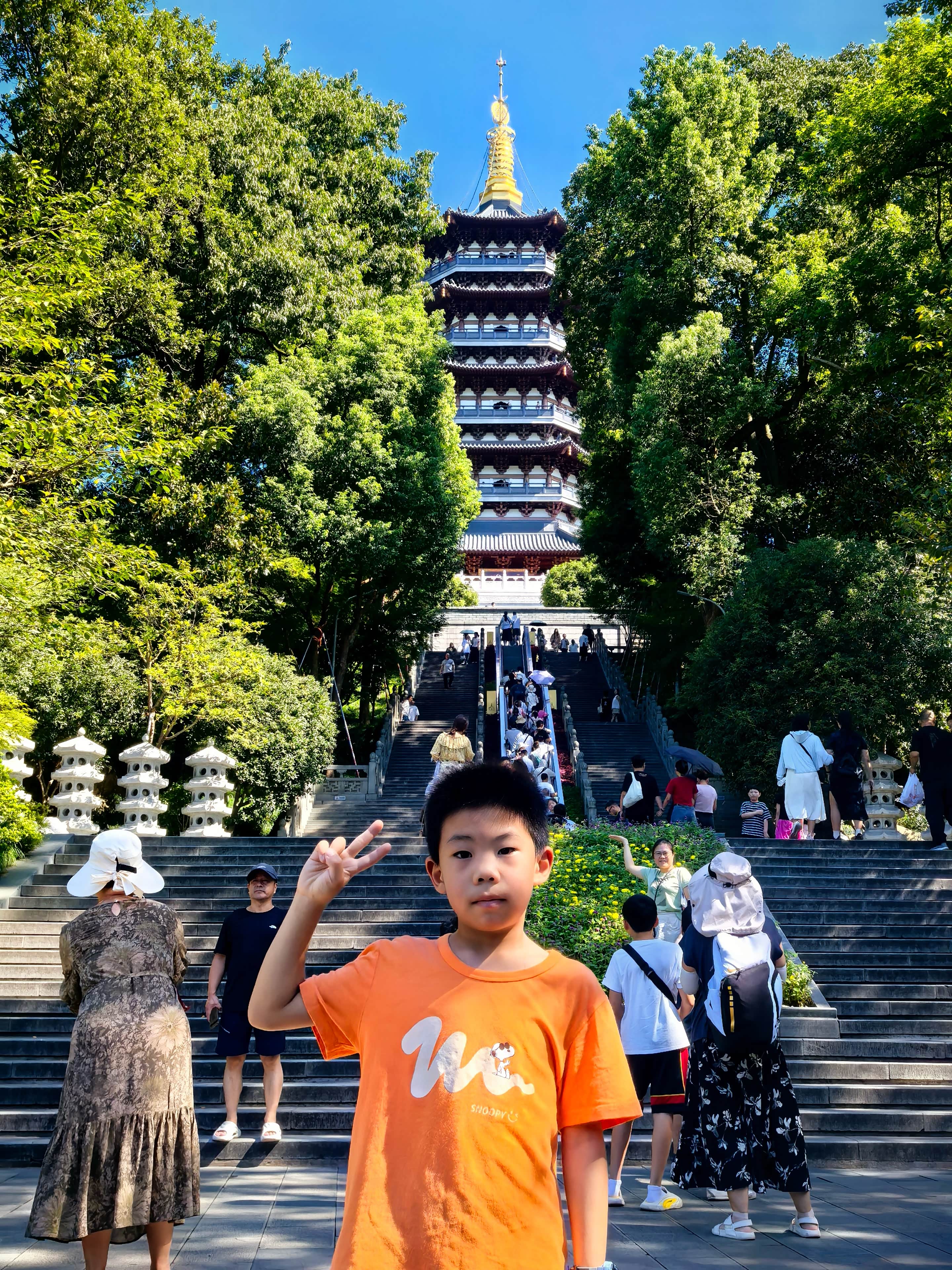 第二天上午去了雷峰塔,这塔在杭州可是有名得很。上到塔顶,整个西湖的景都能看着,老壮观了。塔里还有不少关于雷峰塔的故事和老物件,挺有意思的。