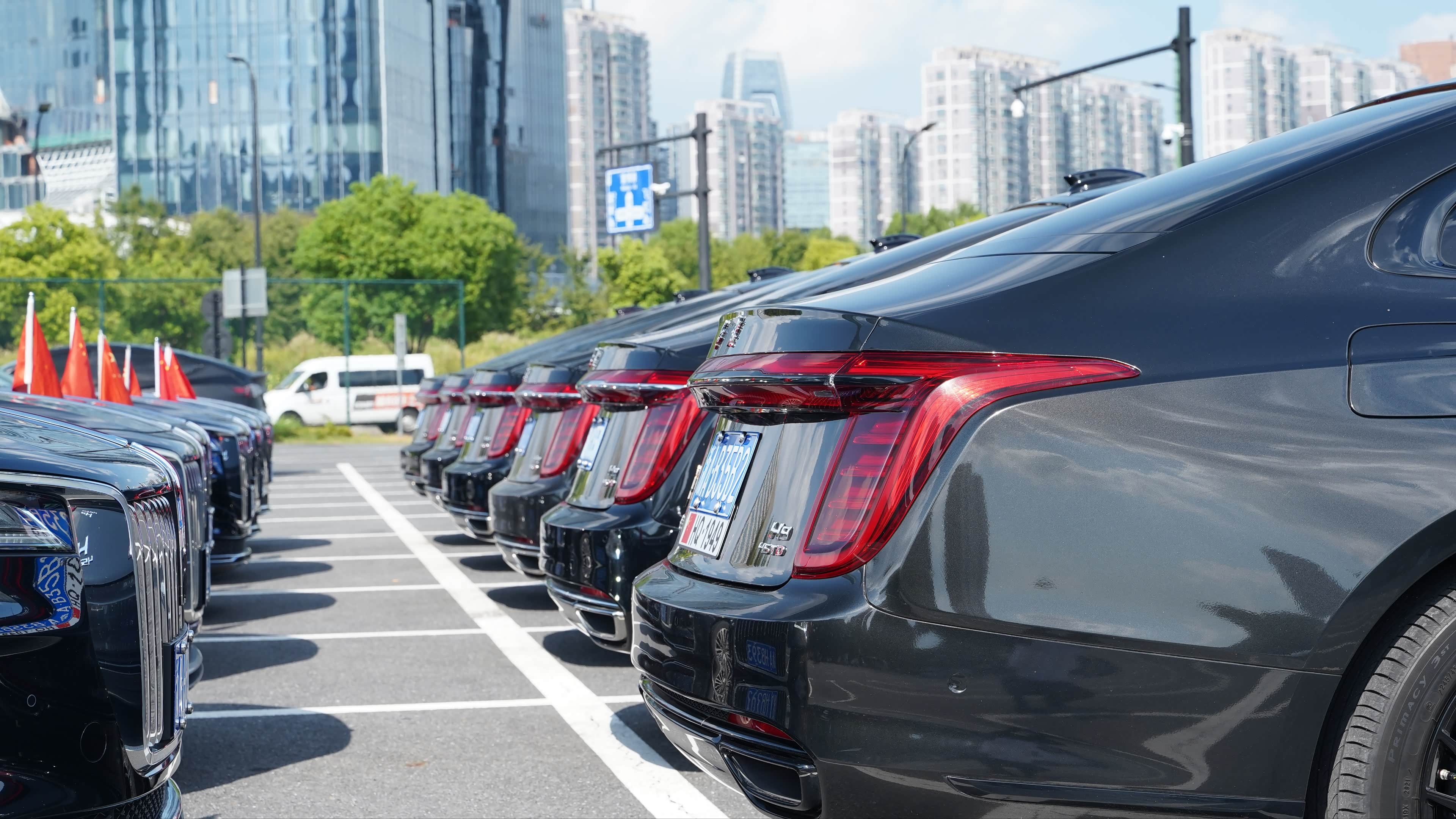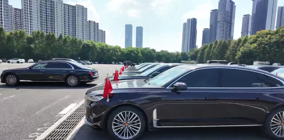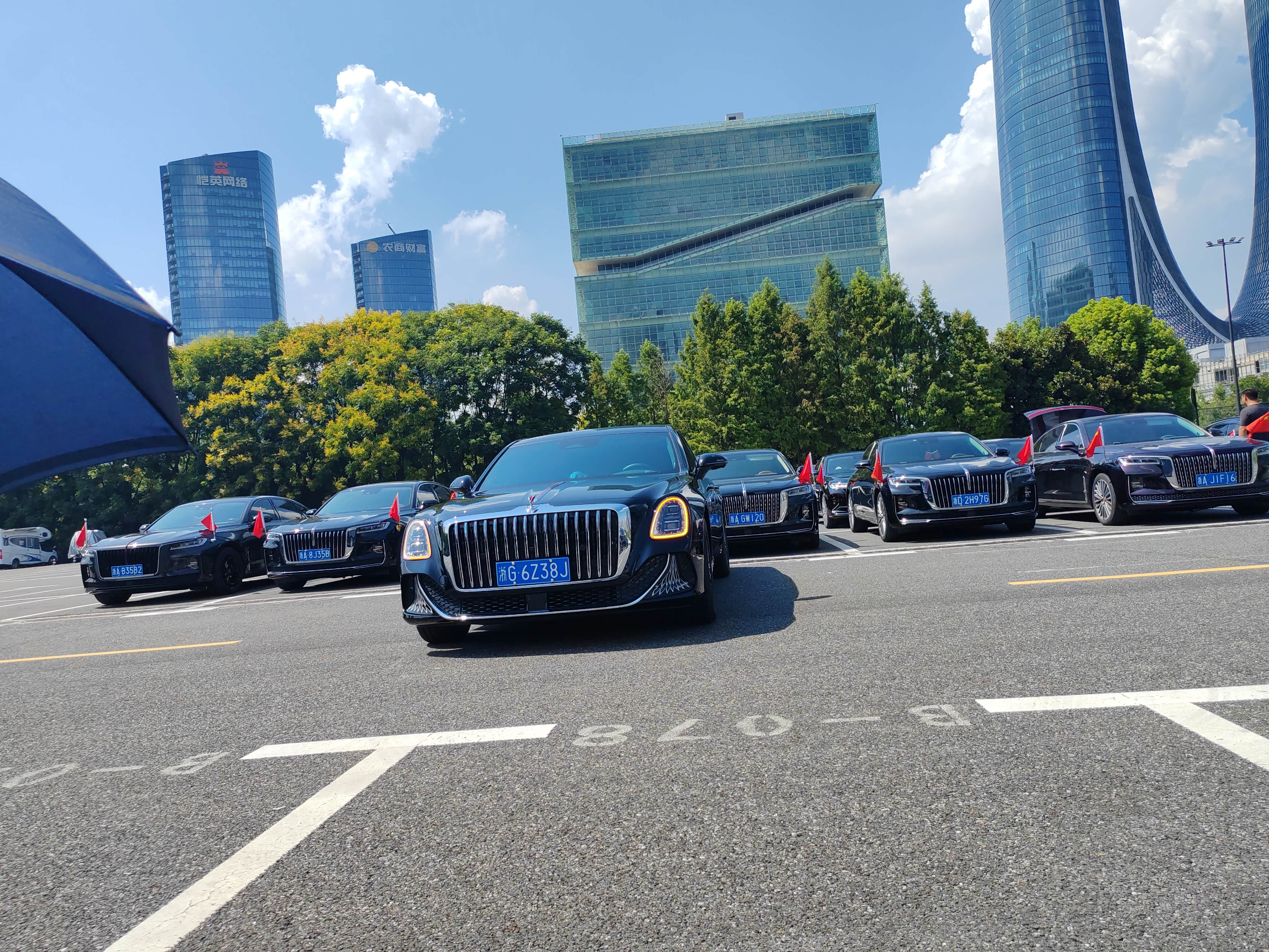 13:30,车友们陆续来到杭州之门集结签到,大家的脸上都洋溢着兴奋与期待的神情。13:40,车队来到场地开始摆队形,“天经地纬六横十二纵,红旗圆你初恋梦”。头车为国雅金葵花和前四排 24 辆 H9 摆头压阵,尽显大气与威严。第五排、第六排、第七排的车辆也按照精心设计的布局依次排列,金色、黑色、白色、双拼色等不同颜色的红旗车相互映衬,构成了一幅美丽的画面。