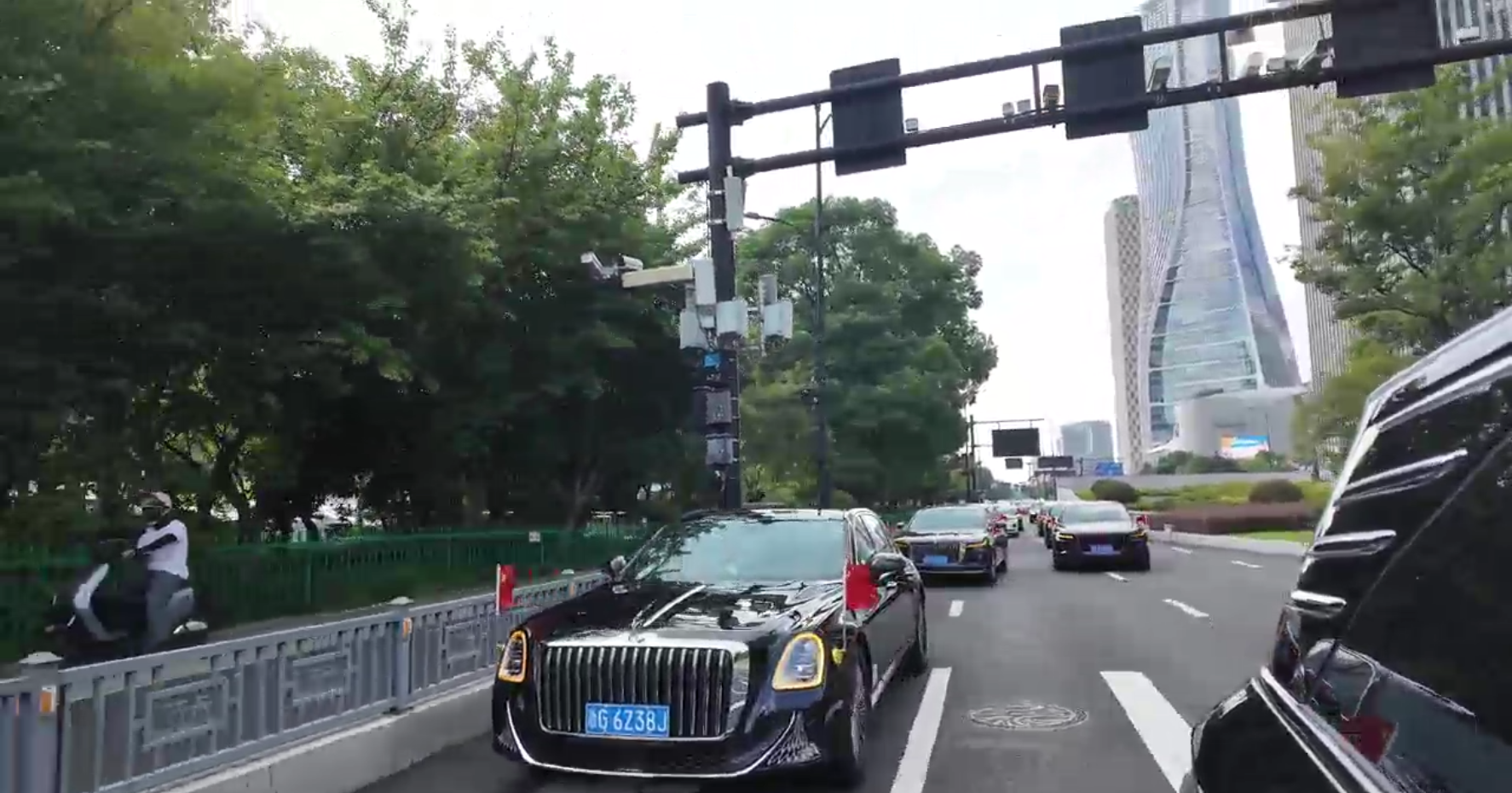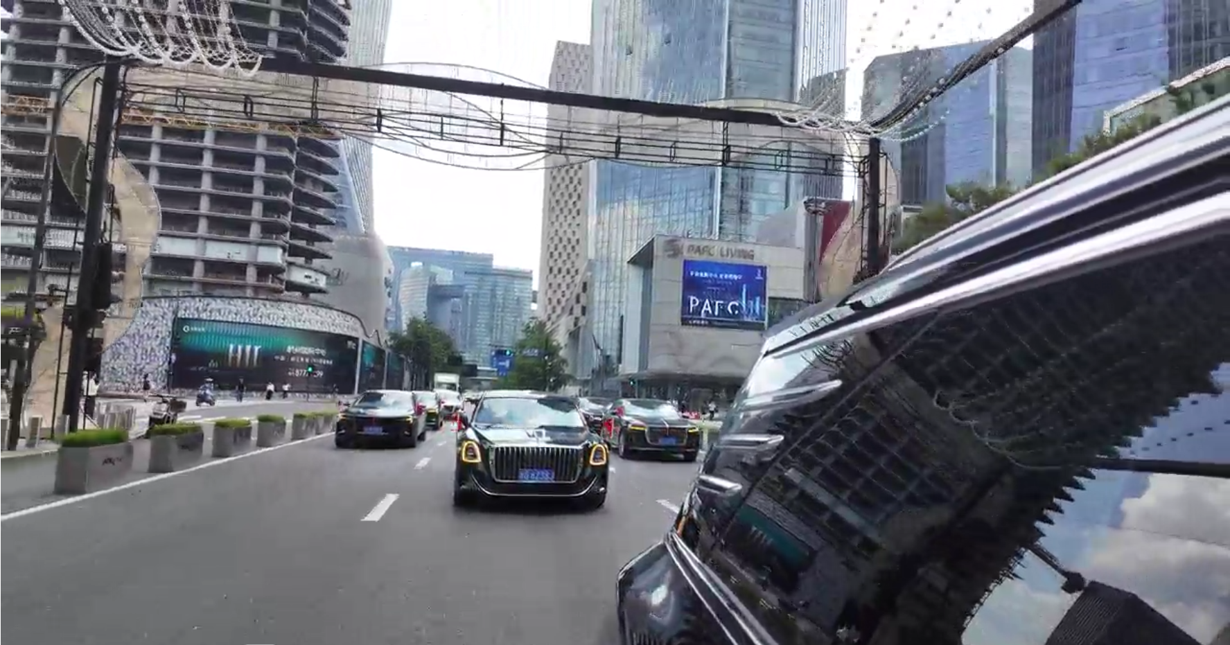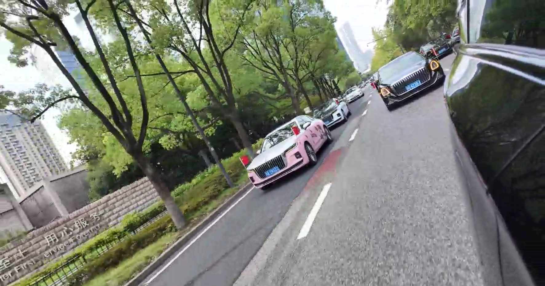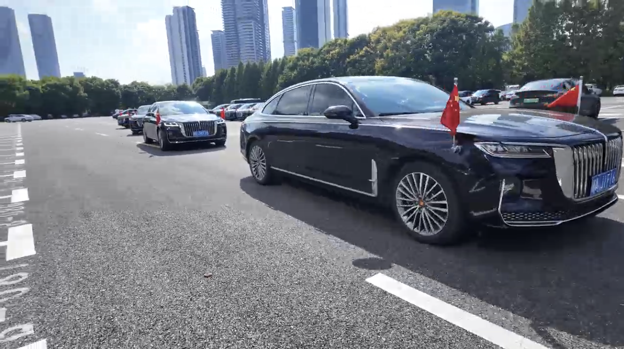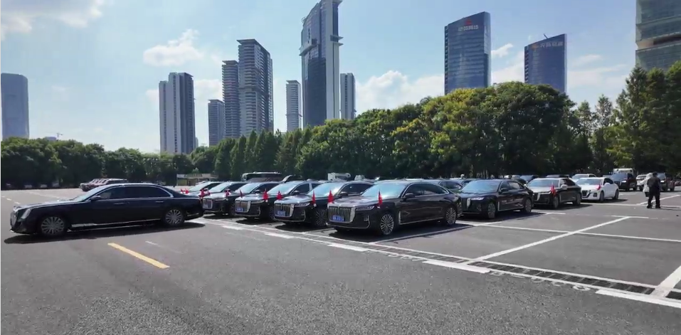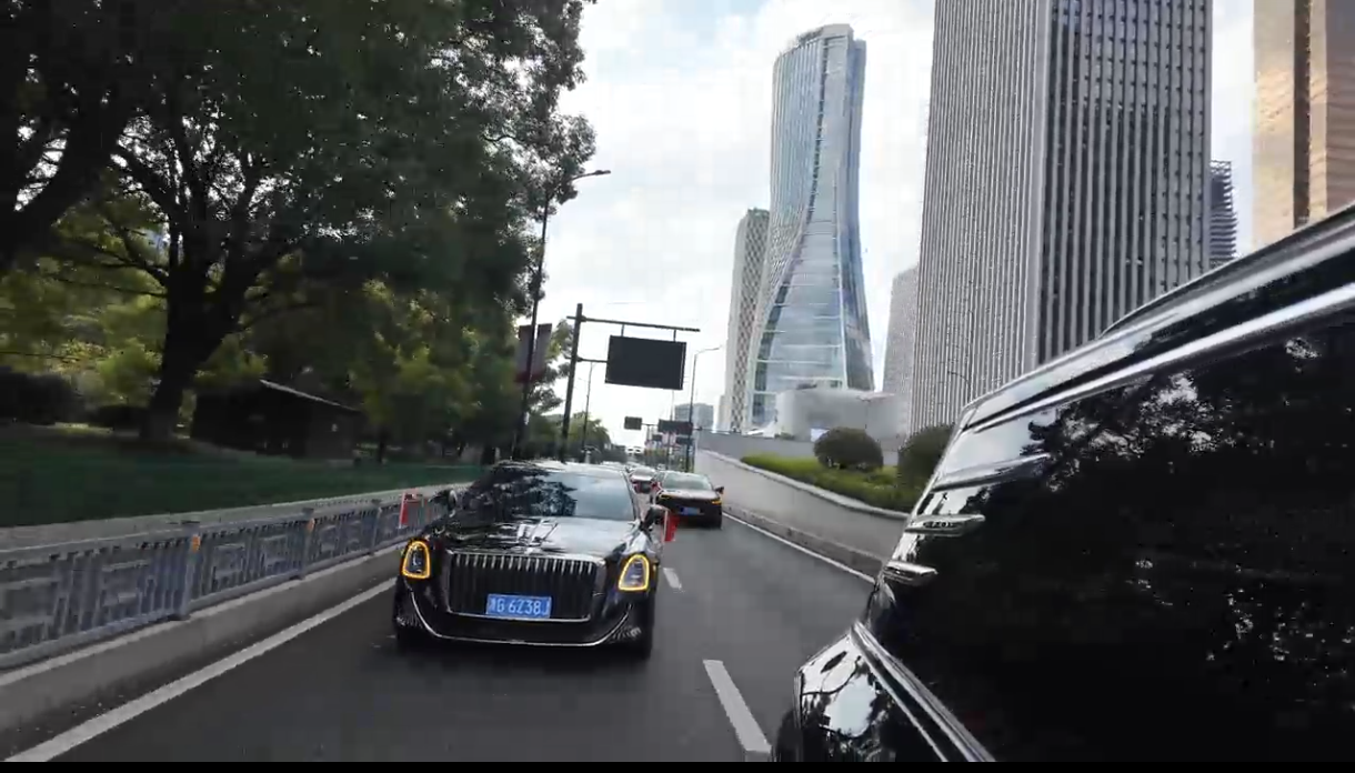 15:30,城市巡游正式开始,车队依次打卡万象城、市民之家、杭州国际会议中心、钱江三桥。车队行驶路线从停车场出发,沿着奔竞大道、博奥路、富春路、解放东路等道路前进,所到之处,行人纷纷,停下脚步观看,正应了那句“ 红旗所到之处,便是理想与希望——目光所致,皆为华夏;五星闪耀,皆为信仰”!