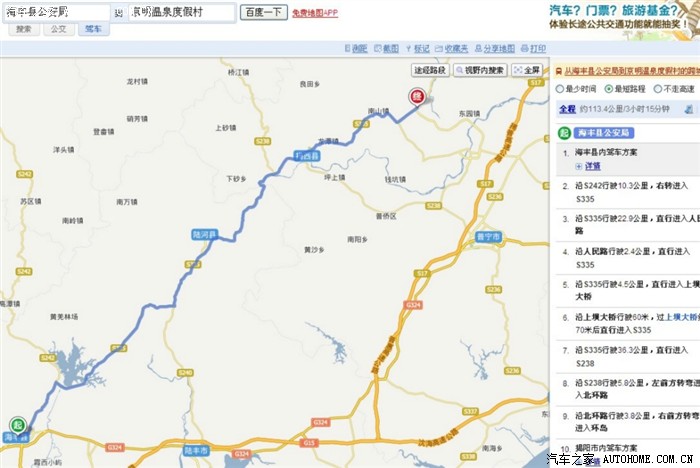 如上图,海丰县离揭西县京明度假村有113公里。
