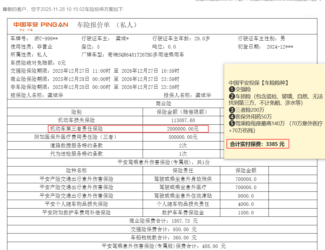 第二年续保对比了很多家,平安续保比较优惠3385