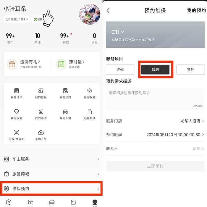 首先,在零跑APP完成预约,在我的-维保预约-保养,选择离自己最近的授权服务门店即可,选择时间后,可以备注当前行驶里程和保养项目~
