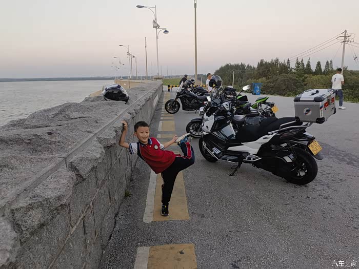 我们在湖边偶遇机车队,很酷,儿子非要给他们合影一张。