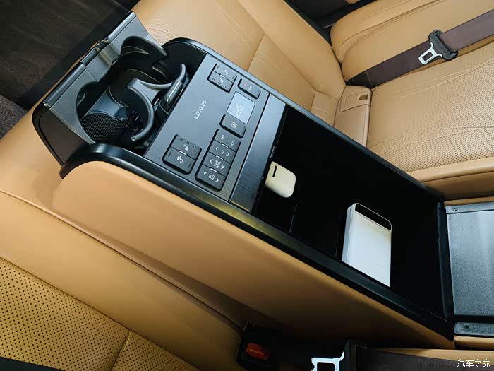 后排的中央扶手可以直接操作空调、后排座椅调节、电动遮阳帘、座椅加热和座椅通风、以及多媒体系统,储物格的空间也很大,我放了一个手机和充电宝参考~