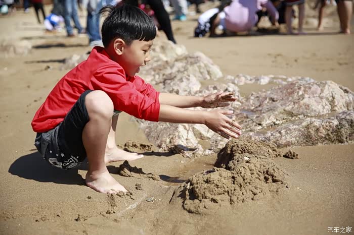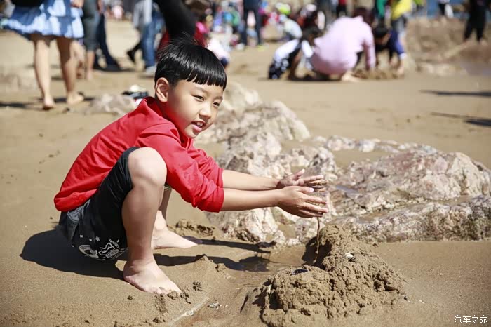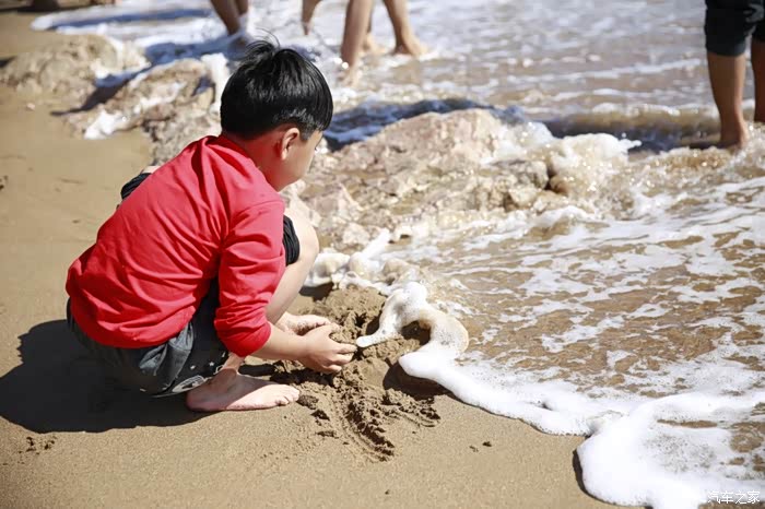 儿子在海边玩耍太开心了,不想走了。
