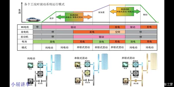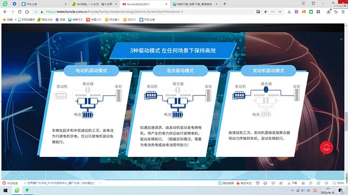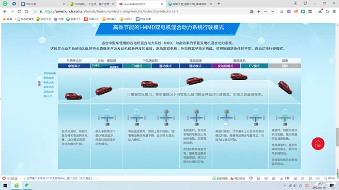 首先,本田混动在发动机直连时,电机可以同时辅助驱动,但这样做的目的不是为了获取更大的动力,而主要是为了调节发动机的运转状态,使其尽量运行在最大热效率区间内,从而达到省油的目的......如:直驱时轻微上坡,发动机在最大热效率区间内的动力不够,那么便由电池放电给电机驱动补足不够的部分...再如轻微下坡,此时发动机在最大热效率区间的动力过剩,此时电机会将发动机产生的多余功率储存到电池......发动机在直驱的时候就是靠着第二种方式达到给电池充电的目的,也就是说直驱状态下可以给电池充电....当电池满了,就会切换成EV模式放电到合适的电量,再切换回直驱模式......当你深踩油门时候,其目的自然是为了更大的加速力,所以会切换到串联模式,也就是发动机发电,再和电池一起提供电力给驱动电机驱动...本田混动输出最强动力的时候就是在串联模式下产生