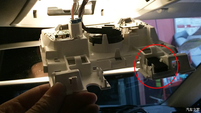 第一个复原的是MIC,需要拆了顶部的天窗控制区,然后将MIC安装到上图右圈的位置,然后再将MIC的连线从机头川到这个位置,和MIC上的接头链接,这样才能使用蓝牙接听电话。