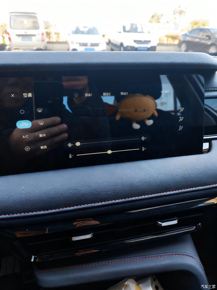 空调就比较有意思了。除了方向盘可以控制以外,它这个是需要从上往下滑的。但你是无法从投屏界面直接选取到现在这个状态。得退还到车机初始状态。在选择空调的预设。非常繁琐,至少需要5步才可以返回。人机工程有待进步。
