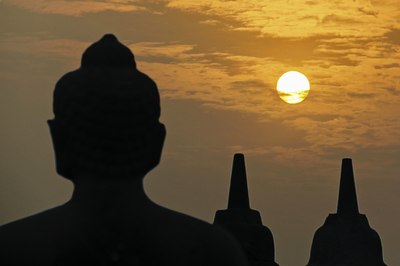 婆罗浮屠意为“山丘上的佛塔”,可能建于公元800年,为世界上最大的佛教建筑群,它与中国的长城、埃及的金字塔和柬埔寨的吴哥窟并称为“古代东方四大奇迹”,高大的佛塔上有众多精美的浮雕及佛龛,每座佛龛里都住着一尊佛像,神秘而壮观。9层高的婆罗浮屠犹如巨石垒成的山丘,从下往上,象征从俗世欲望世界到达涅磐的天堂。