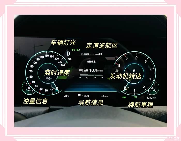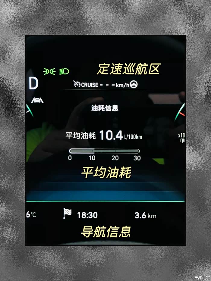 中间位置则是平均油耗的信息,可以自定义为车辆的图片,导航的路线,一般我就设置为平均油耗的信息,随时关注油耗表现。最下面是车内温度、车辆导航的信息(到达时间和预计里程)。