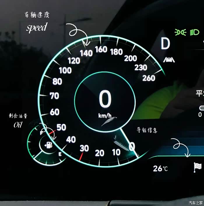 按照从左往右的顺序,小圆圈代表的是油量,E代表的是“Empty”,F代表的是”Full”,加满油指针就会显示在F的位置。大圆圈是代表车1速,是实时显示的,索纳塔这个高清的液晶屏,看的非常科幻。