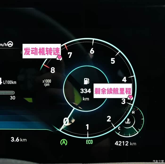 最右侧则是发动的转速,数值需要乘以1000rpm,大圆圈的中间则是剩余的续航里程,右下角是累计行驶里程(也就是保养需要参考的里程数据,记得5000以前要去店里做首保哦)。