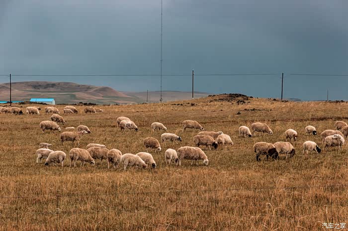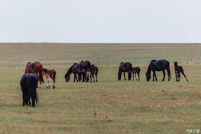 从达里湖景区出来,一路行驶在草原上,四面地形辽阔空旷,可以看到成群的牛羊和马儿散落在草原上。