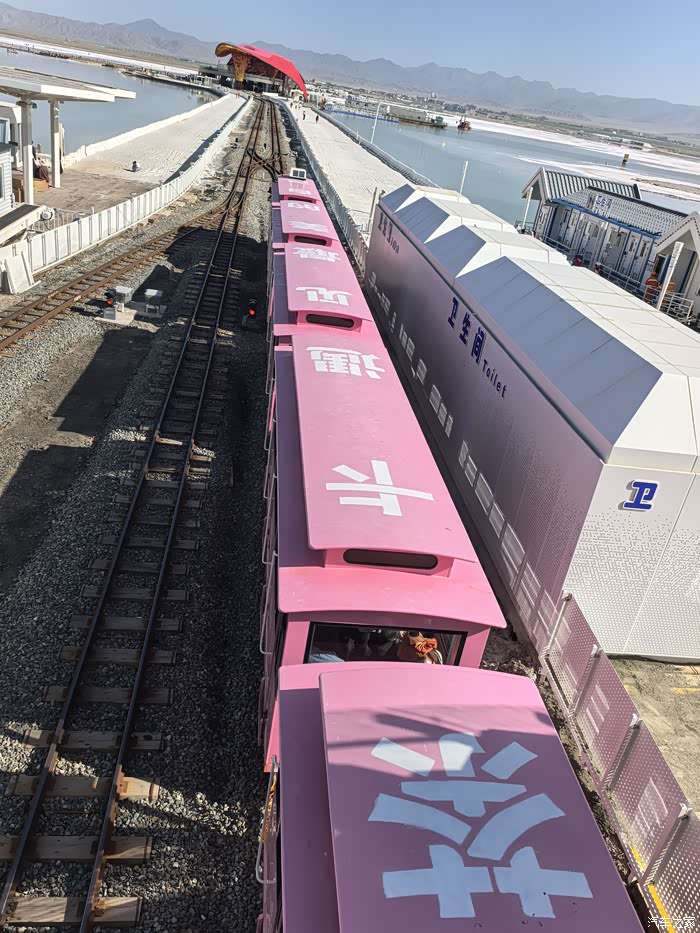 坐着小火车往湖心走的时候,太阳刚好升起来。铁轨两边的盐湖像打翻的牛奶,泛着柔和的银光。盐湖的小火车被涂上不同的外观,成为茶卡盐湖流动的风景线。