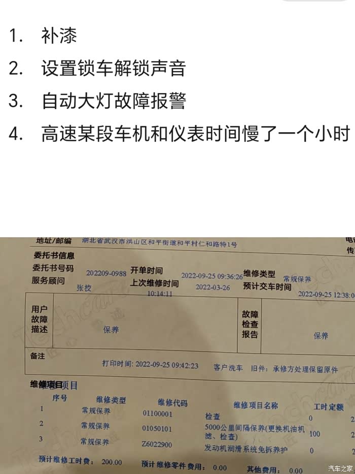 我一般在保养车子的时候,会选择到车间与维修师傅进行沟通。我记录的几个问题,在维修师傅进行车辆诊断的时候,提出了自己的疑问,并且都解答了。一是自动大灯故障,经过回忆,是每次行驶在相同位置区域,会出现这种故障警告,也没有查到故障码,定义为光感应的干扰;二是锁车声音,可以解码设置,4S的电脑没有权限,需要自己去刷机开启;三是车机和仪表在高速上时间慢了一个小时,是设置了根据GPS调整时间的问题,在车机上将该选项取消以后,就好了。