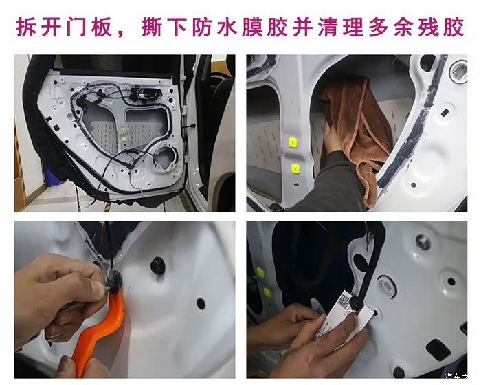 首先带大家了解一下原车门板,原车门板仅有一层防水膜,在隔音上的效果毫无作用,撕开这层膜以后,周边还有一圈沥青,相比很多车主都知道,日系车都有这么一层沥青,并且沥青非常稀疏甚至有的会直接流出门板。