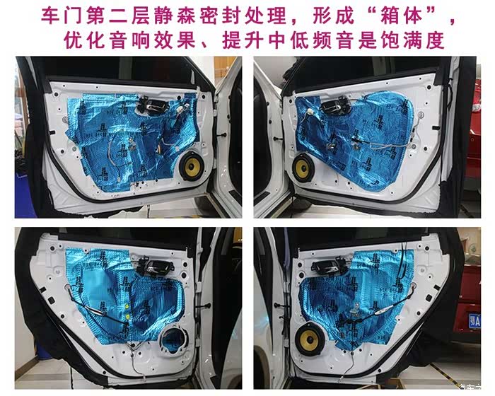 门板隔音第二层静森隔音止振板,对整个门板进行密封隔音处理,使整个门板形成一个箱体,让门板上的喇叭发挥的效果更好。