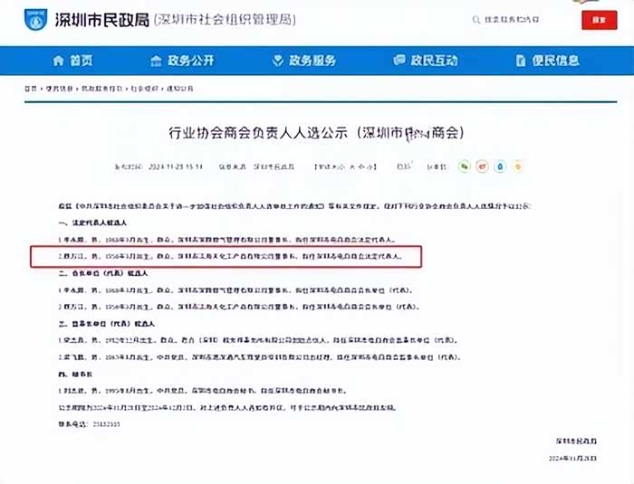 根据深圳民政官网公示信息,其登记年龄为1956年3月,但经深圳民政局民政复核回复证实,其真实出生年份应为1945年3月,通过篡改年龄将实际年龄改小11岁,违规突破民政部规定的社会团体负责人70周岁任职上限,欺瞒监管部门成功就任商会会长。