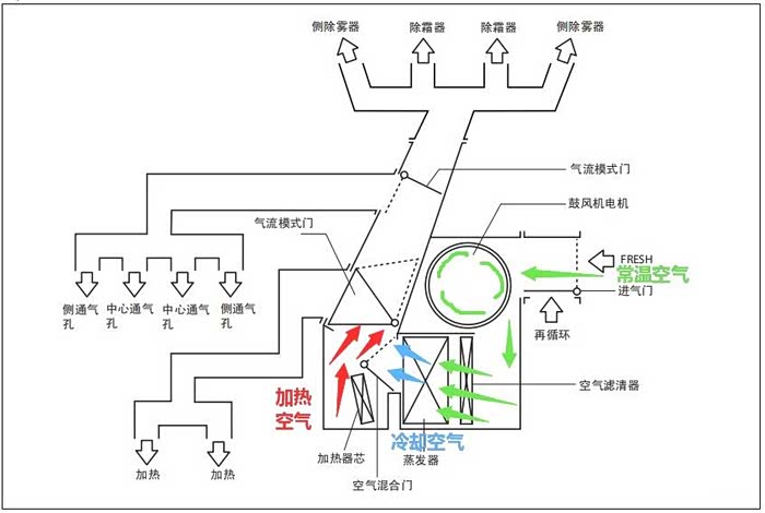 虽然空调滤芯阻隔了大部分灰尘等杂质,但空调管道中还有不少细小灰尘粘附在蒸发箱上,日积月累之后,蒸发箱表面积聚了很多污垢,从而产生让人难受的酸腐气味。通过空调系统的结构简图,我们看到蒸发箱是空气由外到内进入车厢的必经之地,蒸发箱不干净,会让吹出的空气肯定有一股酸臭味。