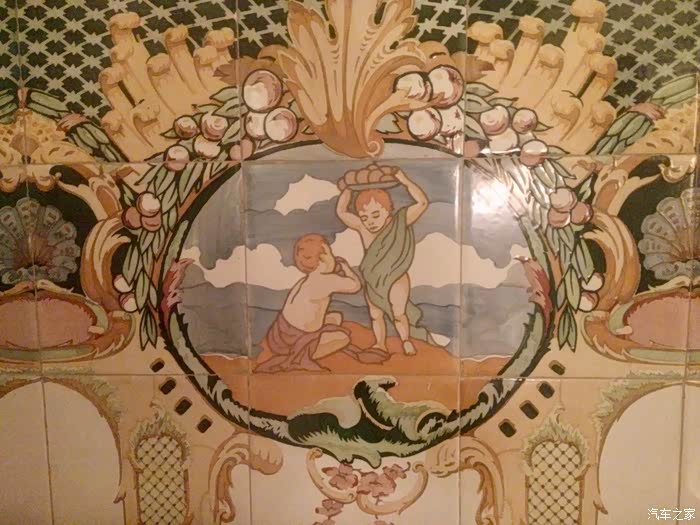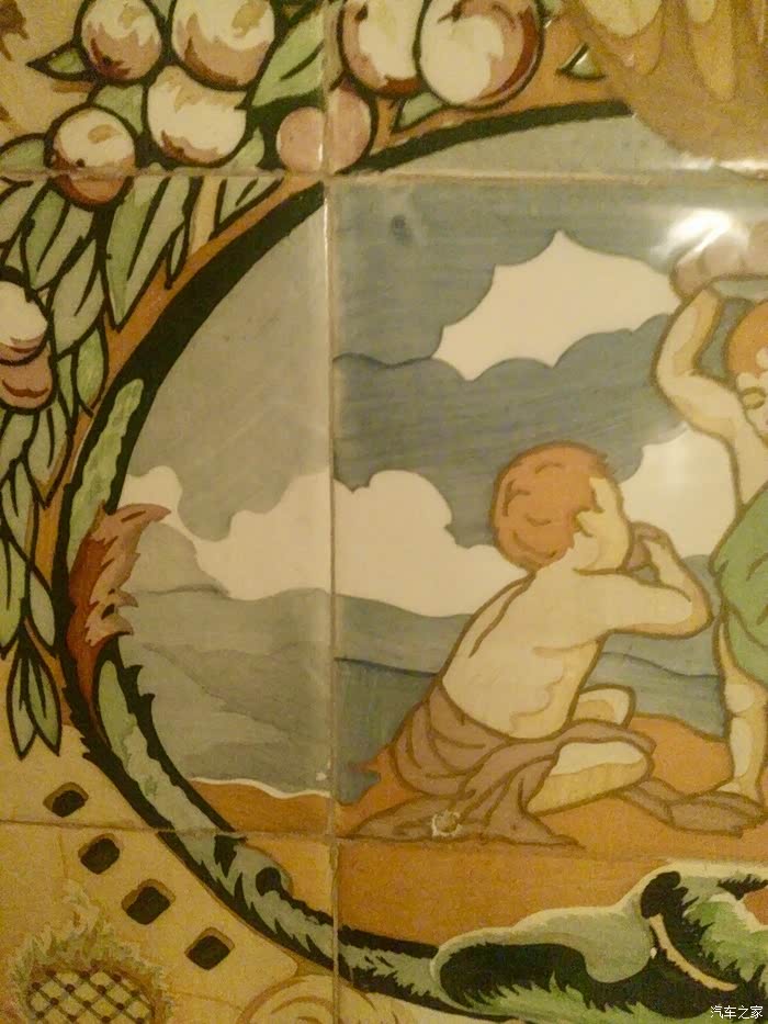 例如:墙上的瓷砖,中间的儿童,原来是裸体的,其中一代主人觉得裸体不雅,把所有瓷砖换成了穿着衣服的孩童,所以中间的瓷砖和边上的瓷砖,颜色是不同的。