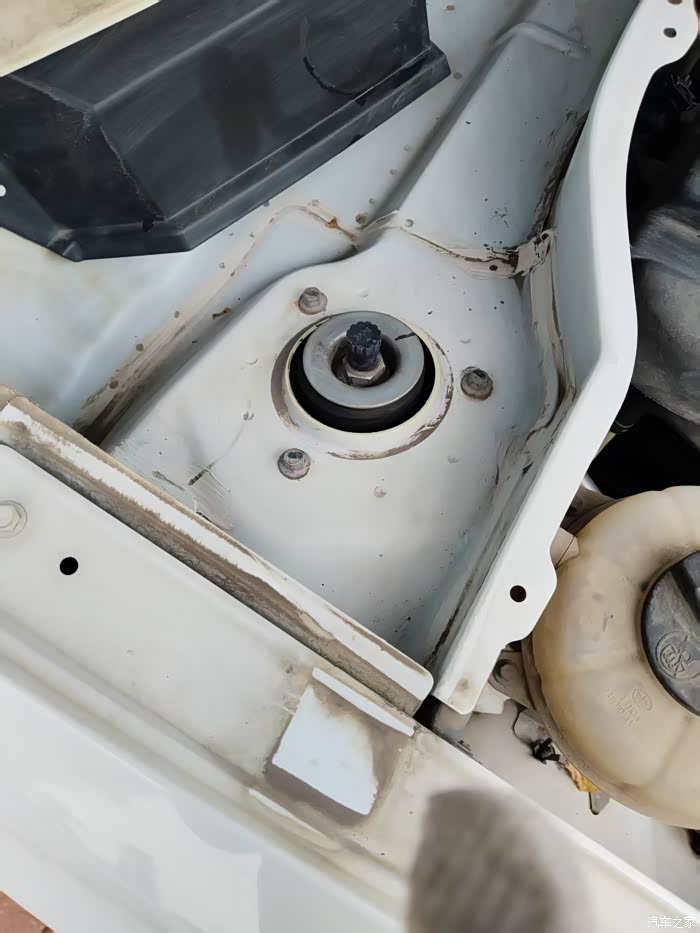 这个不要着急。有一定危险性。一定要注意安全。压缩到位,用电动扳手拆掉减震器塔顶螺丝。