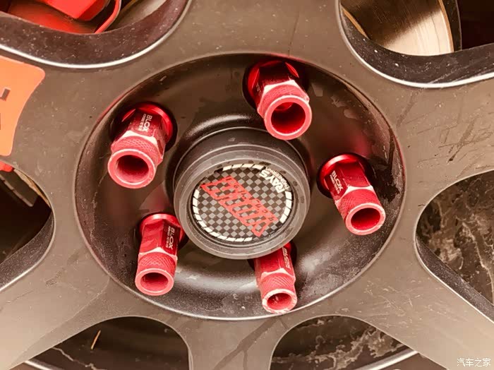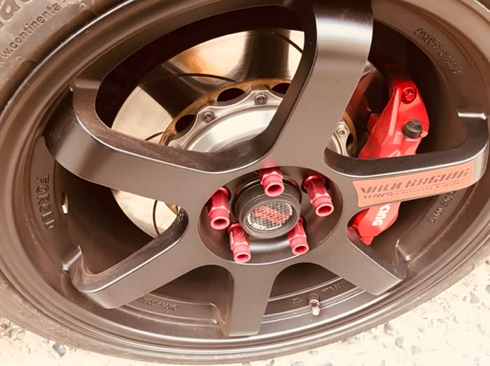 改了动力后感觉原厂17寸轮毂和胎跟不上了,赶紧换轮毂和胎,18寸TE37轮毂加马牌性能胎