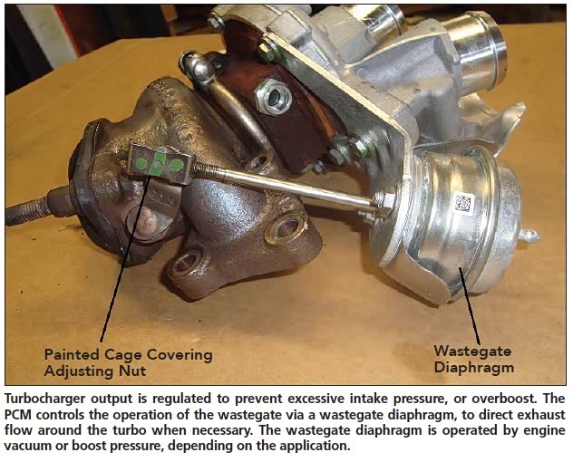 必须调节涡轮增压器输出,以防止过大的进气压力或过载。动力总成控制模块(PCM)使用涡轮增压器安装的废气门控制排放到涡轮的排放流量,当需要时可以引导涡轮增压器周围的排气流动。根据应用,废气门由发动机真空或增压压力操作的隔膜打开。 PCM使用进气歧管安装的MAP传感器来监测增压压力。然后,使用废气门调节阀螺线管,它命令隔膜移动一个提升阀,将排气流重新定向在涡轮机周围。阀门通过弹簧压力保持在关闭位置。螺纹杆将隔膜连接到阀门,尽管杆具有调节螺母,但不可调节。杆从工厂出来,在调节螺母上涂上一个笼子。如果保持架缺失,或者油漆受到干扰,有人试图调整,并且必须更换整个涡轮,因为废气门和杆不能单独维修。