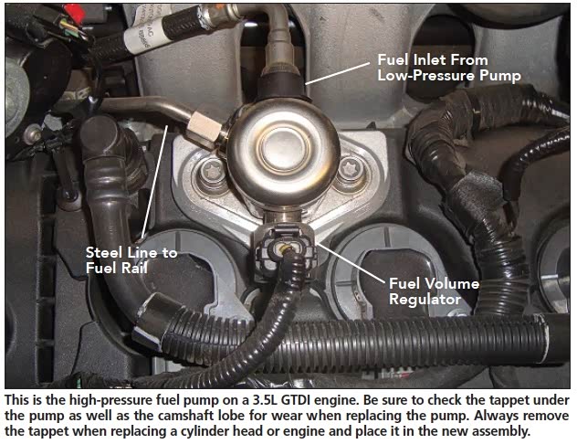 来自怠速GTDI发动机的轻轻敲击声音,这不是阀门的声音,而是高压泵的正常运行。 出厂时在泵上安装了橡胶噪声抑制器,以帮助抑制噪音。 不要忘了重新安装抑制器,因为如果没有,客户会听到轻轻敲击声音,并回来会告诉你,“自从你修好了我的车......”我们都喜欢这个。