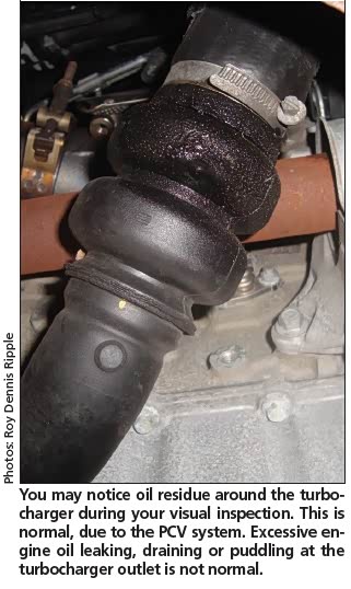 在对GTDI发动机进行任何诊断之前,可以目视检查所有进气和真空软管连接。 最小的空气泄漏可能导致驾驶性能问题并设置DTC。 在目视检查期间,您可能会注意到涡轮增压器附近有油渣。 这是正常的,由于PCV系统。 漏油,排水或灌水是不正常的。
