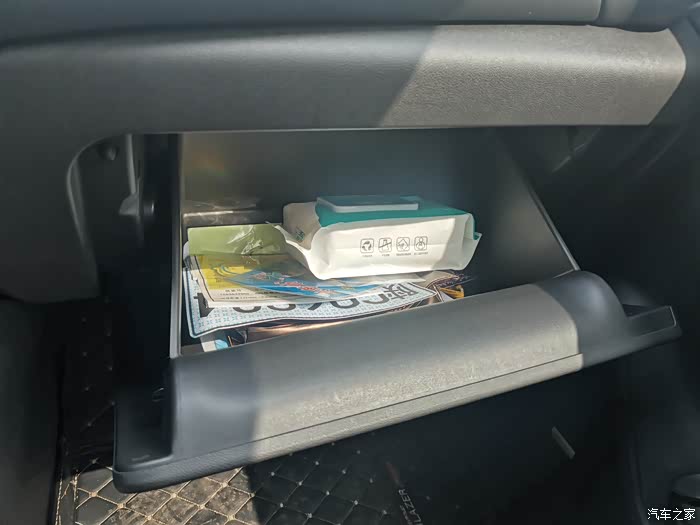 先说说这个手套箱,跟传统的不一样,开始方式是在上面有按钮,带有阻尼,不改说高大上,也挺实用,从里面放的杂物来看,不是特别大。