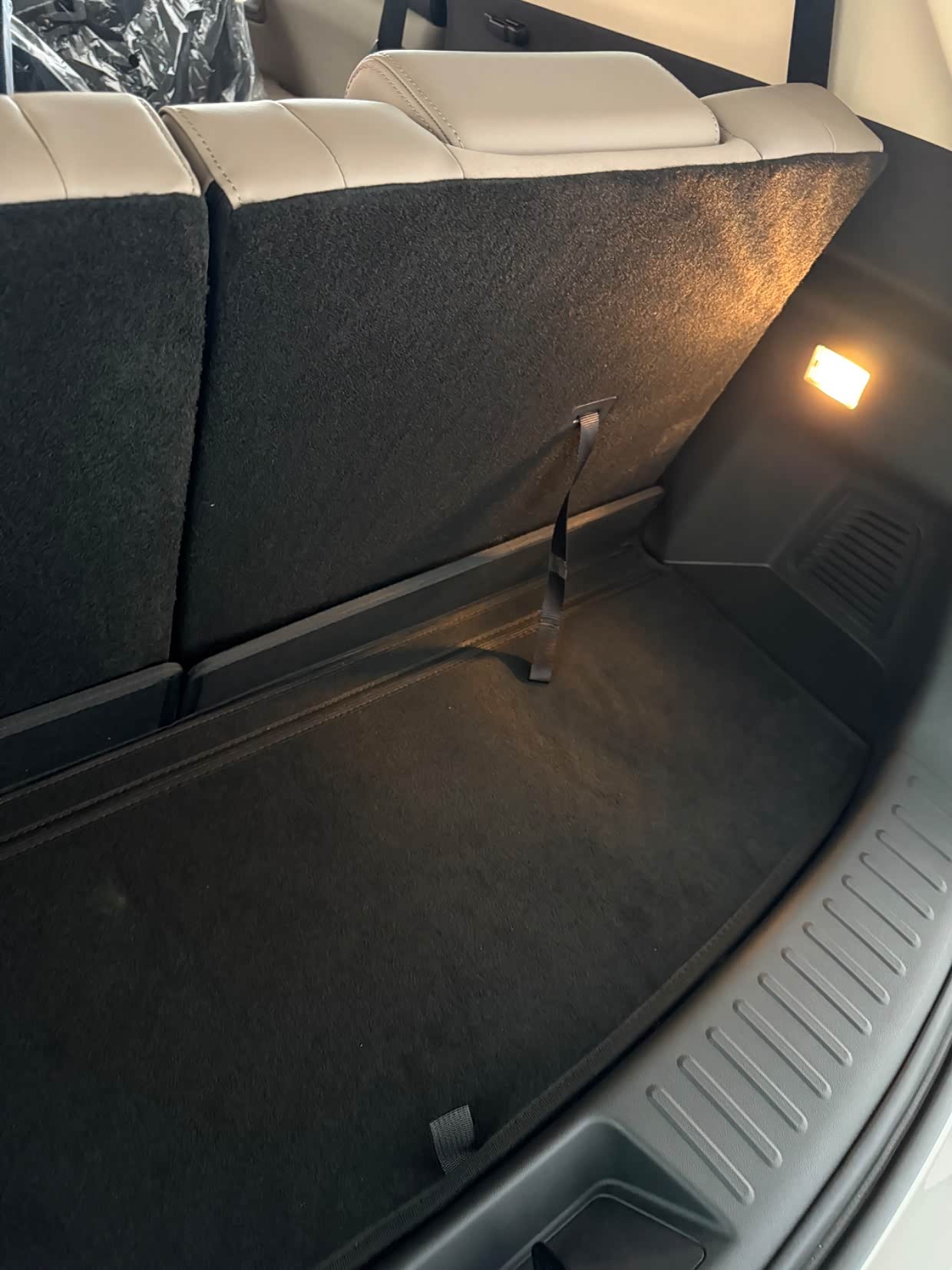 空间表现也远超预期,2785mm的轴距让后排腿部空间格外宽裕,朋友坐后排跷二郎腿毫无压力。后备箱开口低、容积大,上次搬家时,把后排座椅放倒,居然轻松塞进了行李箱、折叠桌和几箱杂物,堪比小型货车,实用性直接拉满。座椅软硬适中,包裹性不错,长时间开车也不会觉得累,加上扎实的底盘和FSD自适应悬架,过减速带时震动过滤得很干净,颠簸路面也不会有多余晃动,舒适性完全在线。