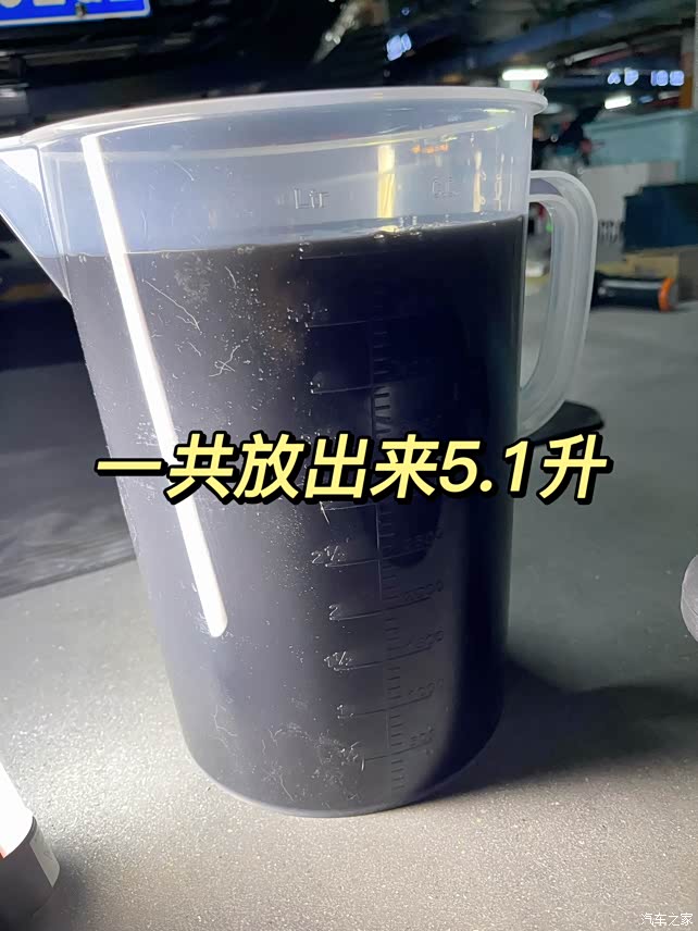 1.通过量杯测量放出的变速箱油量,我这里放出来5.1L,并不多,可能跟我只举升了一边车轮,变速箱不在水平状态有关。