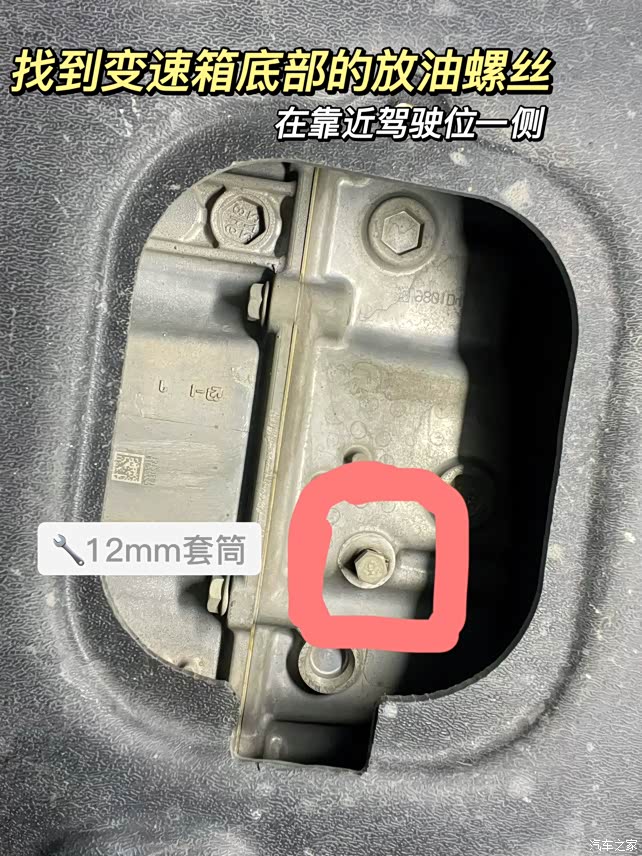 2.找到变速箱放油螺丝,用12mm套筒拧开并准备好接油盆接油