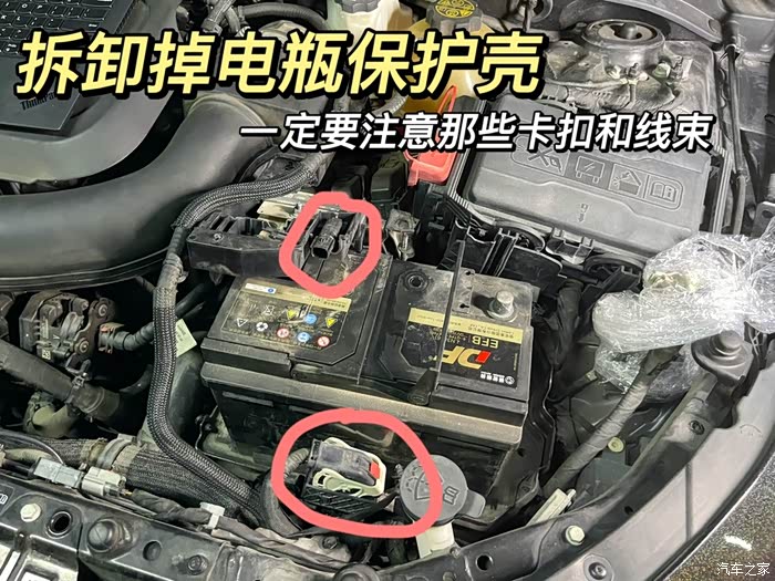 3.拆除电瓶固定压架,记住螺丝顺序,并移除电瓶保护壳上的一些线材的固定卡扣,并移除电池保护壳