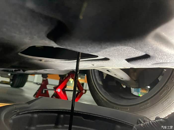 2.不要熄火拆卸左侧轮胎,用千斤顶把车身调整至水平状态,注意放好安全支架。