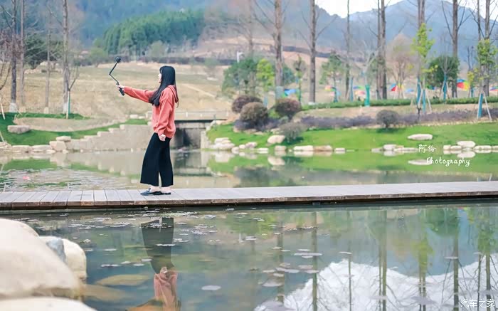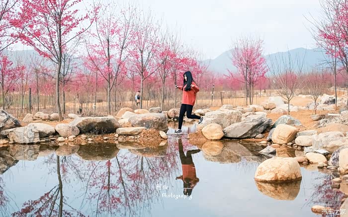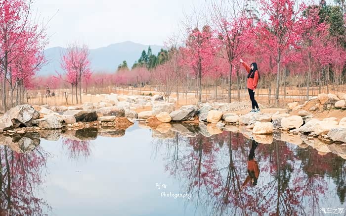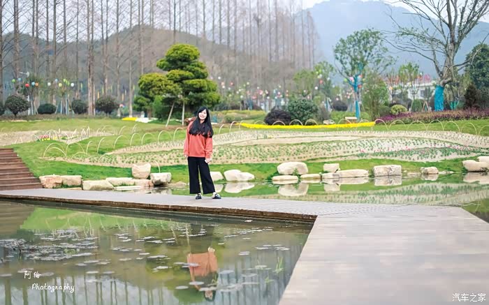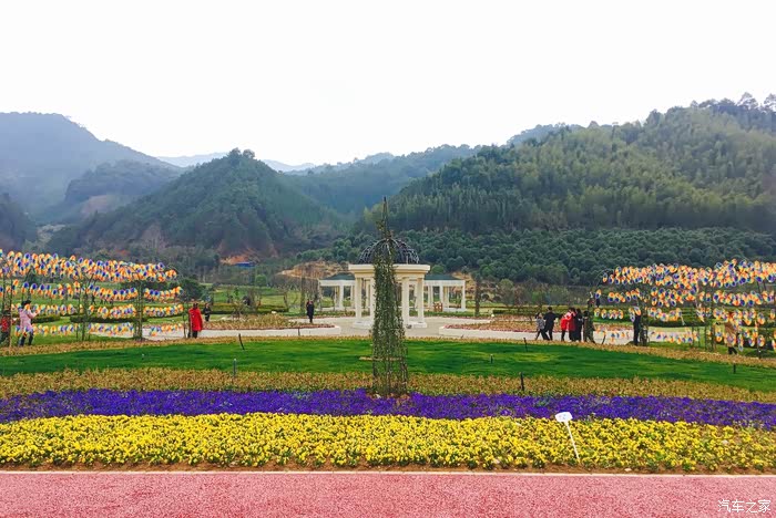 由于花千谷还未完全竣工,再加上快过年,所以我们到的时候处于一种无人看管的程度,看得到有社关卡,但是没人看守,所以大家车都是直接开进去,我们也跟着进去,停在了路边,媳妇看到这美景,下车后就像飞到花丛中的蝴蝶一样