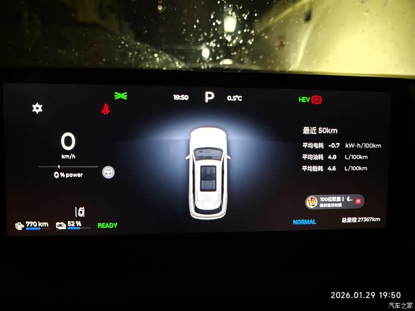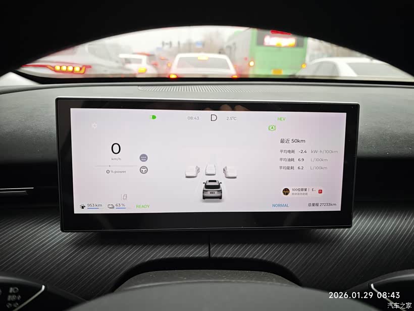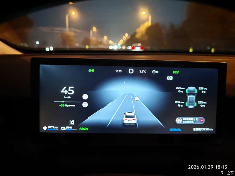 开始记录,回收低,普通模式,导航显示48km,1小时路程,全程强制保电,室外温度2.5度,空调auto24度,座椅加热主驾副驾都是一档,司乘等总体重约200kg.冷车胎压2.1-2.15mpa.